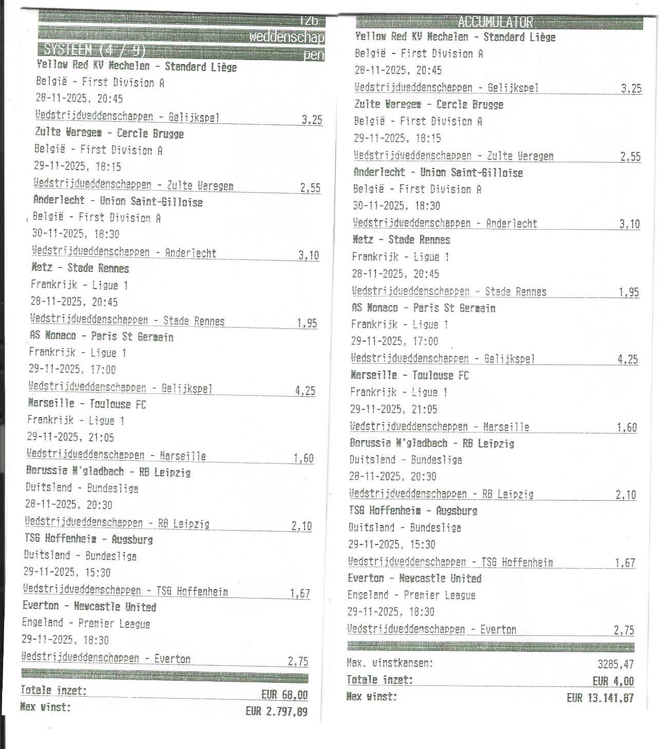 zo krijgen we 1 formulier van 68,00 euro (systeem 4) en een joker formulier van 4,00 euro (hier moeten we 9/9 halen, maar de opbrengst is dan ook veel groter)